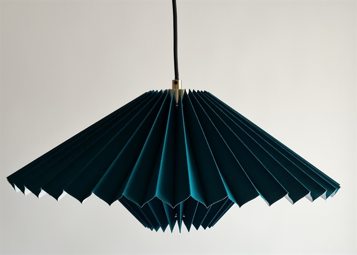 Ans pendel mørk petrol-messing Ø45, i plissé mørk petrol bomuld, med ophæng messing med 3 meter sort tekstil ledning, loft montering Ø10/2,5, skærm diameter 45 cm, højde 20 cm, incl. E27 8W LED pære.