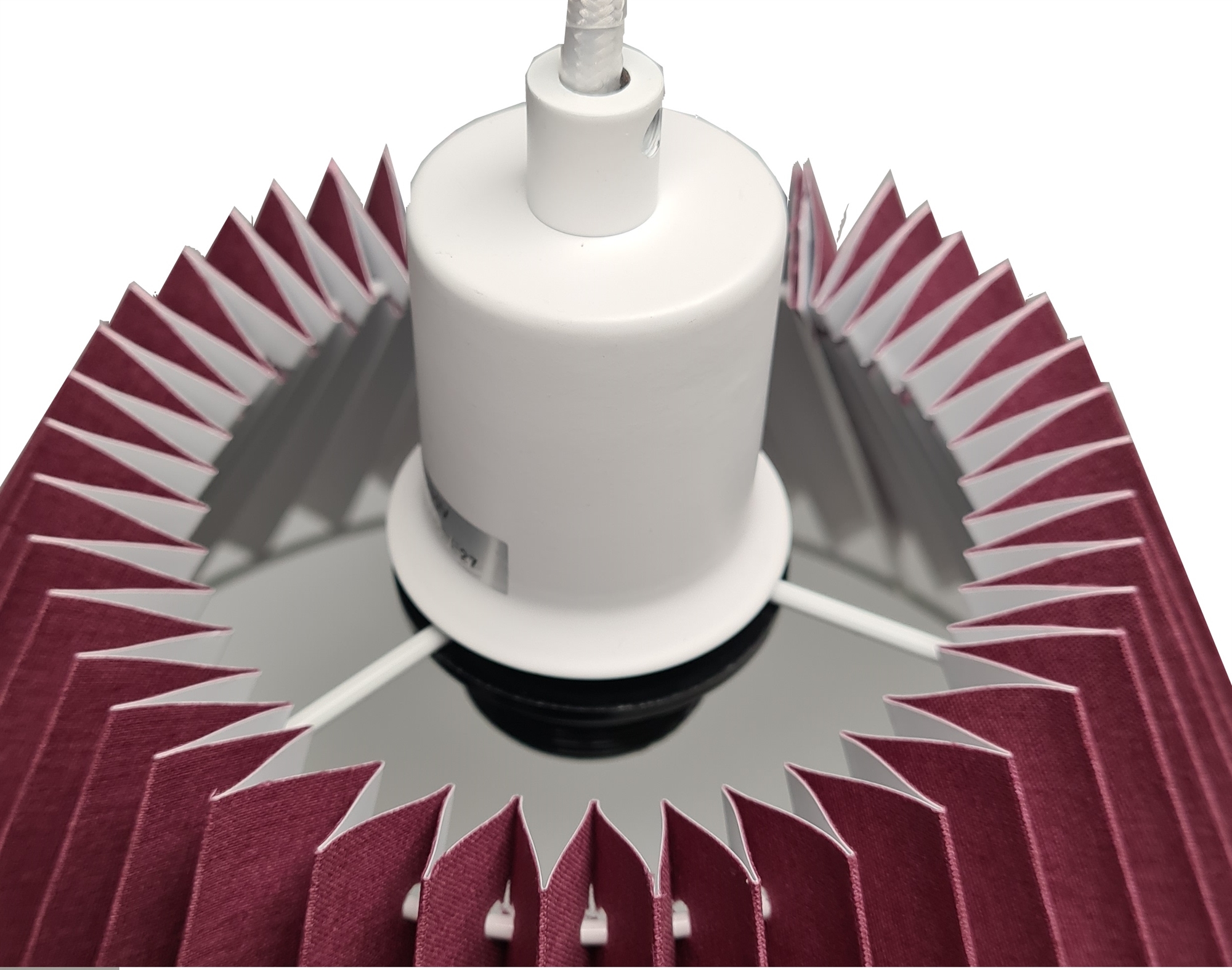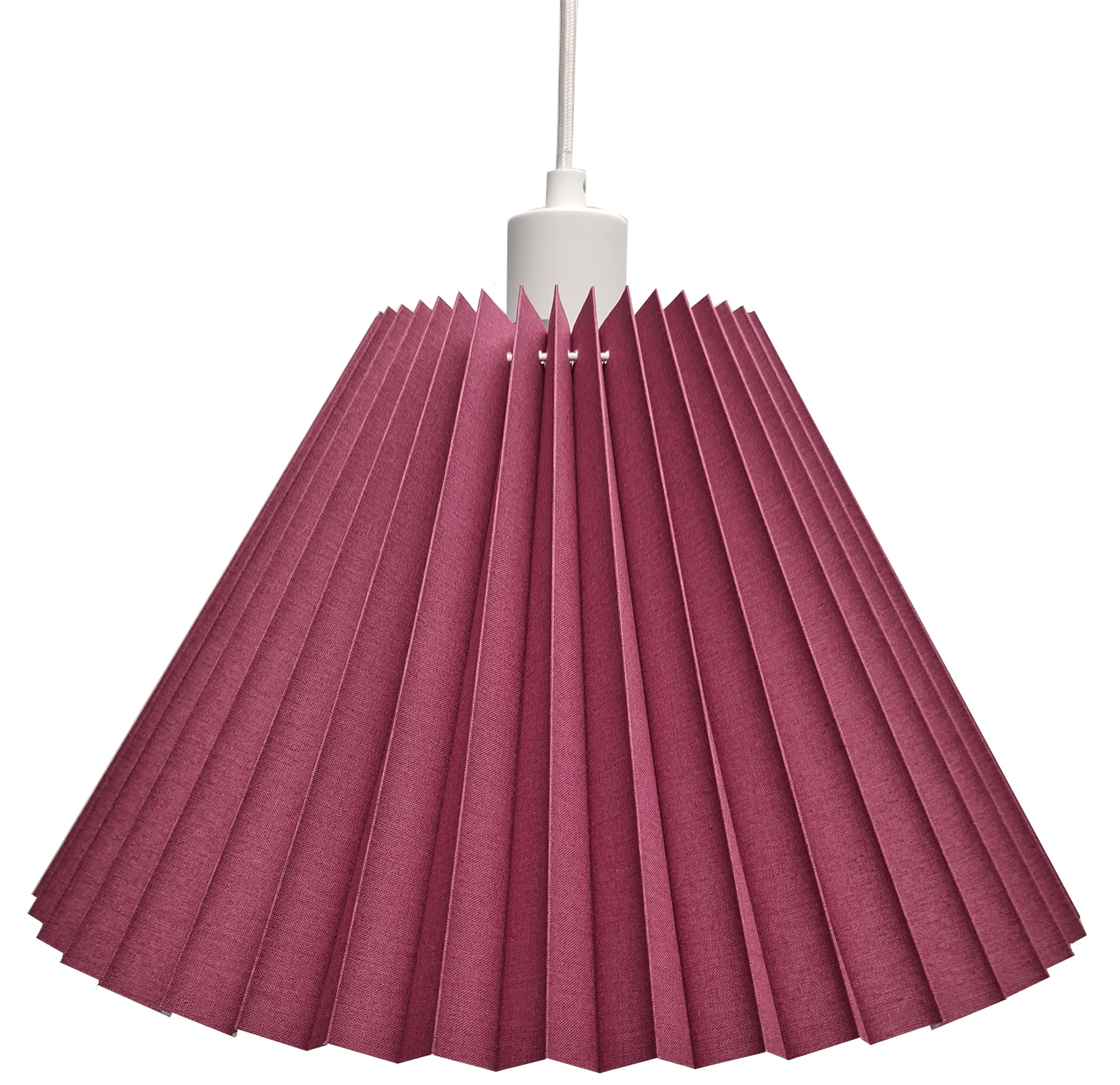 Assens pendel gl. rosa-hvid Ø38, i plissé gl. rosa bomuld, med ophæng hvid med 3 meter hvid tekstil ledning, loft montering Ø10/2,5, skærm top 14 cm, side 25 cm, bund 38 cm, højde 26 cm, incl. E27 8W LED pære.
