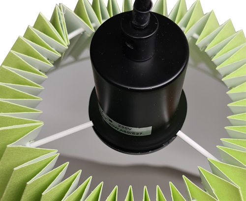 Assens pendel lime-hvid Ø38, i plissé lime bomuld, med ophæng sort med 3 meter sort tekstil ledning, loft montering Ø10/2,5, skærm top 14 cm, side 25 cm, bund 38 cm, højde 26 cm, incl. E27 8W LED pære.