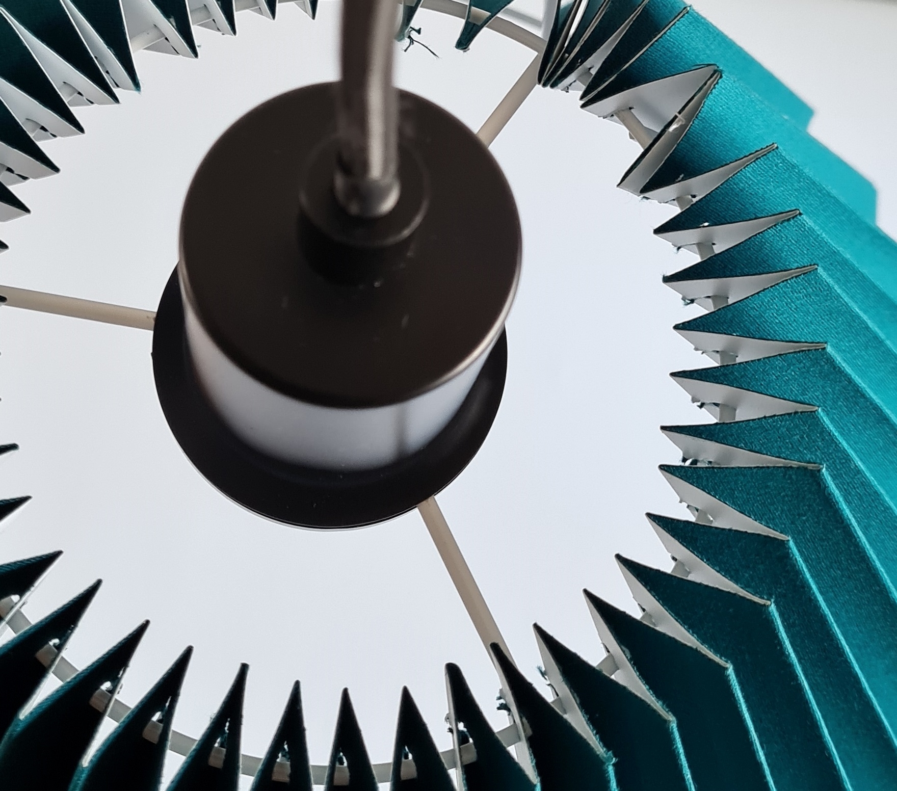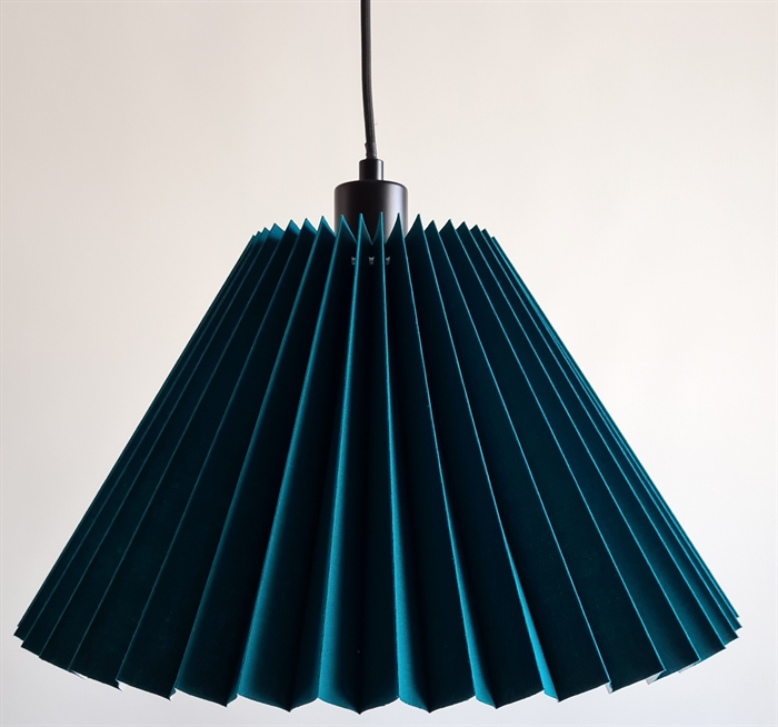 Assens pendel mørk petrol-hvid Ø38, i plissé mørk petrol bomuld, med ophæng sort med 3 meter sort tekstil ledning, loft montering Ø10/2,5, skærm top 14 cm, side 25 cm, bund 38 cm, højde 26 cm, incl. E27 8W LED pære.