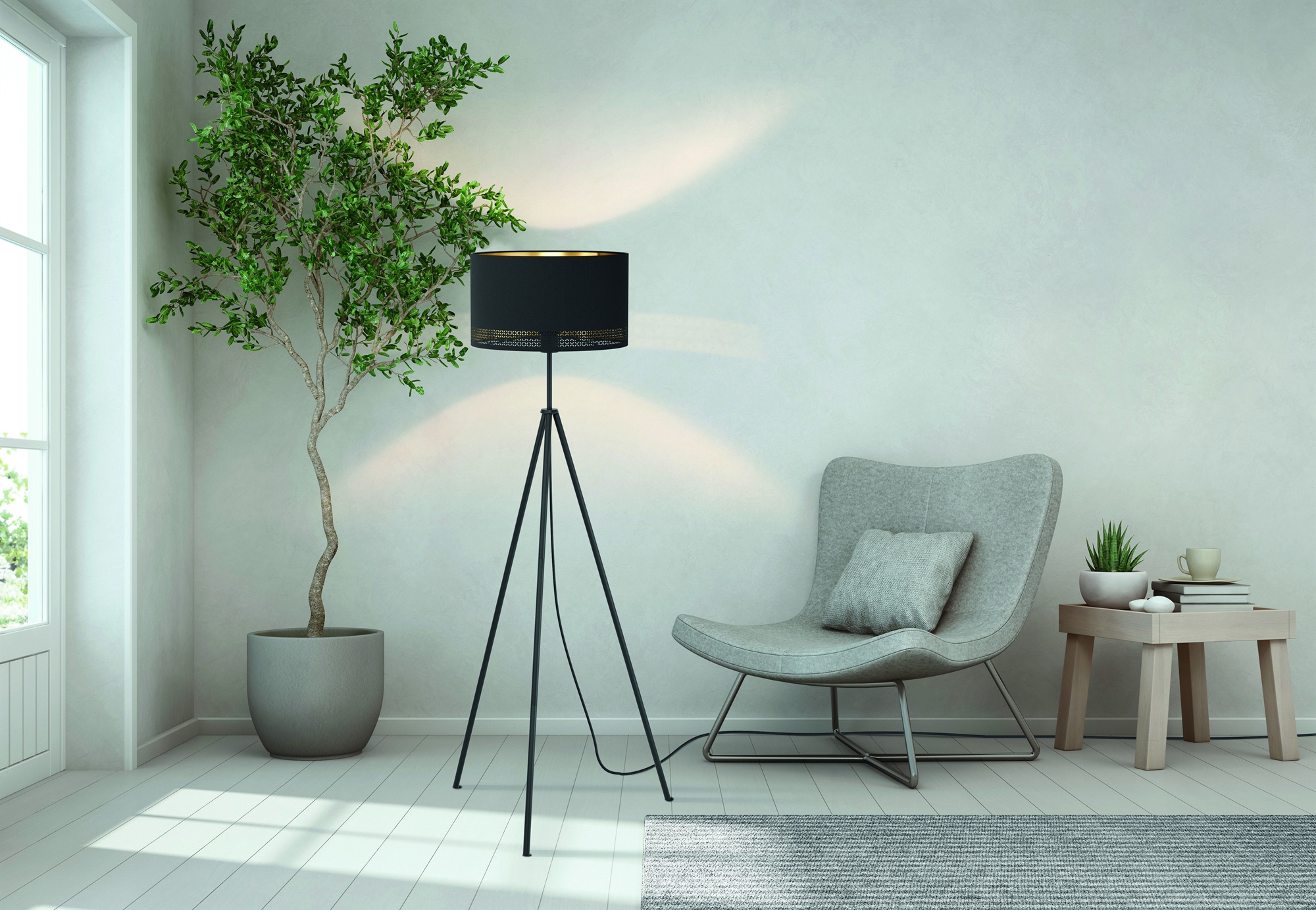 Esteperra gulvlampe H140 i sort metal, med lampeskærme i tekstil sort med guldfolie indvendig, med fodafbryder, MAX 40W E27, skærm 38 cm, Base 68 cm, højde 140,5 cm.