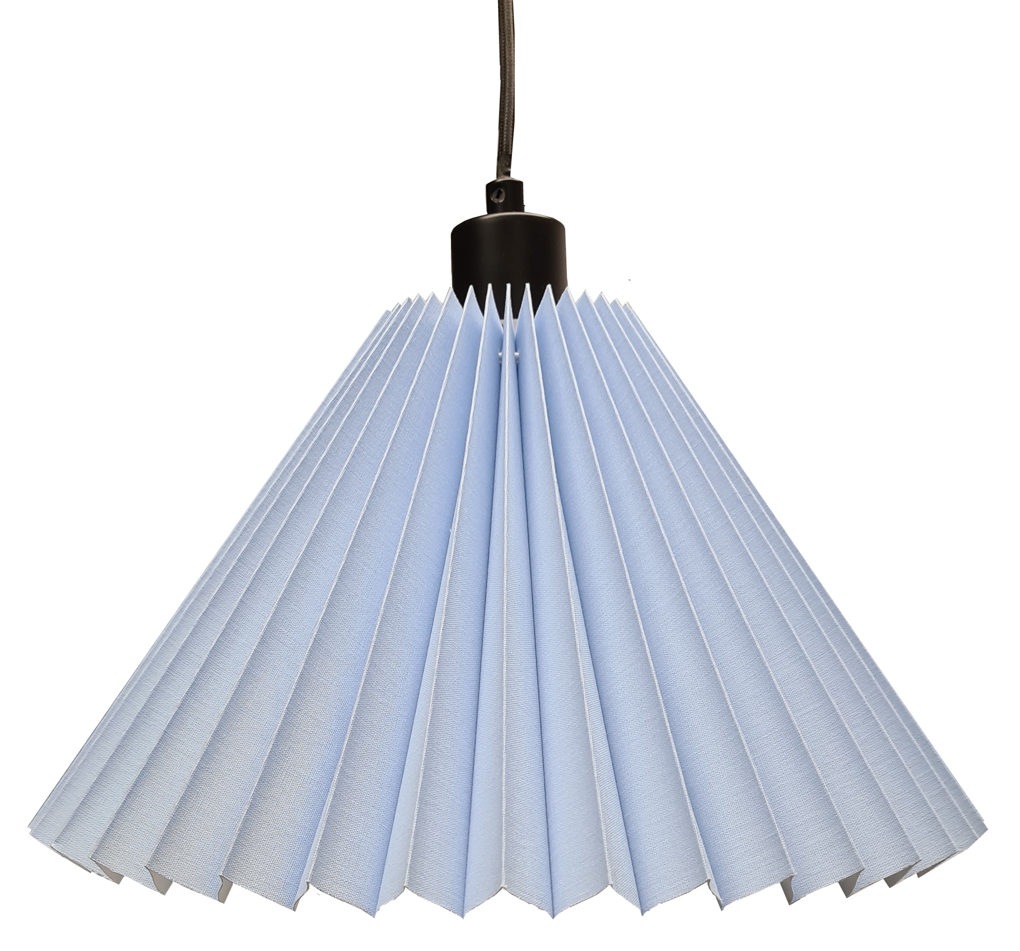 Hobro pendel is blå-sort Ø34, i plissé is blå bomuld, med ophæng sort med 3 meter sort tekstil ledning, loft montering Ø10/2,5, skærm top 9 cm, side 23 cm, bund 34 cm, højde 23 cm, incl. E27 8W LED pære.