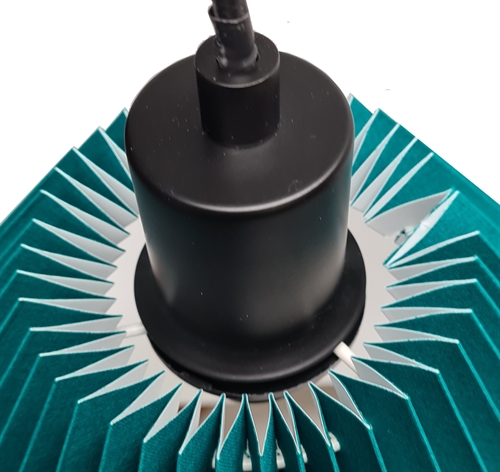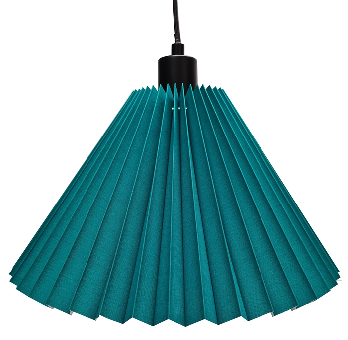 Hobro pendel petrol-sort Ø34, i plissé petrol bomuld, med ophæng sort med 3 meter sort tekstil ledning, loft montering Ø10/2,5, skærm top 9 cm, side 23 cm, bund 34 cm, højde 23 cm, incl. E27 8W LED pære.