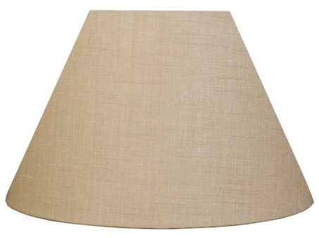 Lampeskærm i skrå model 10x14x23 T-E14 sandfarvet hør, top 10 cm, side 14 cm, bund 23 cm, montering i bund T-E14 fatning med omløber ring.