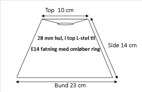 Denne lampeskærm i creme chintz er perfekt til at tilføje stil og elegance til enhver lampe. Den har målene 10x14x23 cm og passer til en L-E14 fatning uden låg. Med en topdiameter på 10 cm, en sidehøjde på 14 cm og en bunddiameter på 23 cm er denne lampeskærm ideel til at skabe et blødt og behageligt lys i ethvert rum. Den er nem at montere med en omløberring og passer perfekt til enhver indretning. Tilføj denne smukke lampeskærm til din lampekollektion.