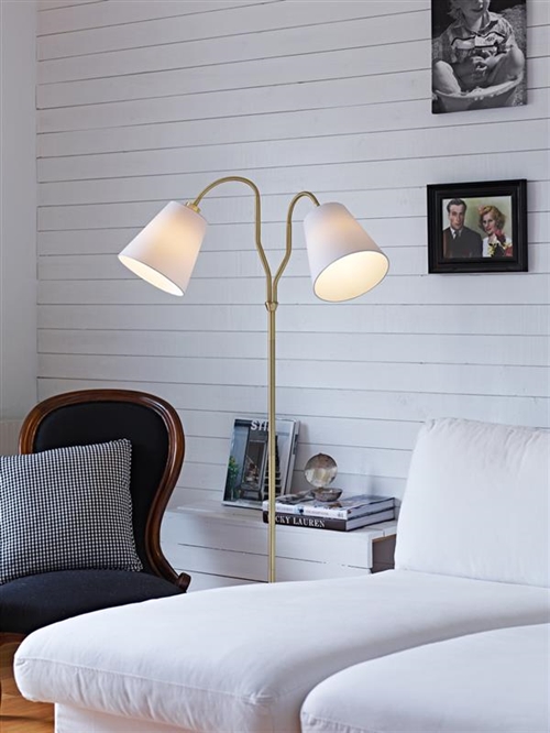 Modena gulvlampe i metal Messing med lampeskærme i Hvid tekstil, med afbryder på lampen, MAX 2x60W E27, Base 23 cm, bredde 58 cm, højde 152 cm.