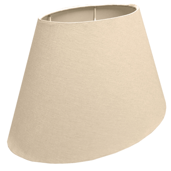Oval 15x18x28 T-E14 sandfarvet bomuld håndlavet med ombukket kanter, top 15x11 cm, side 18 cm, bund 18x28 cm, montering i bund T-E14 til E14 fatning med omløber ring.