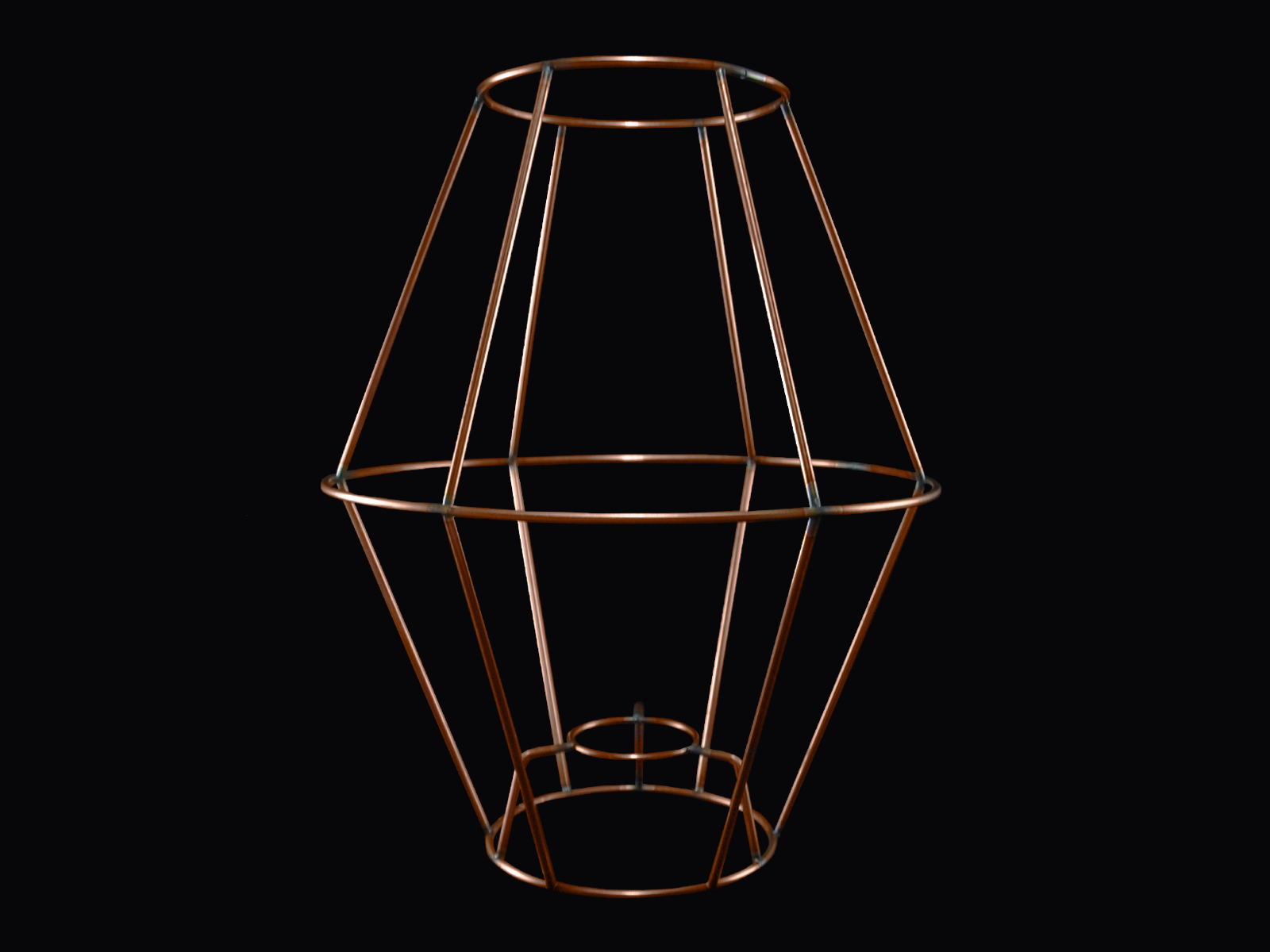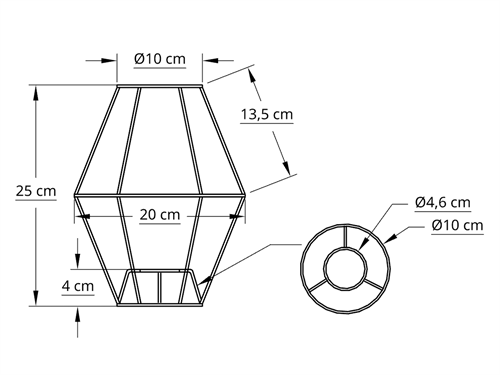 Satelit stativ 10x20x25 T-E27 rå H25 i metal 3mm forkobberet jerntråd, anvendes til bordlampe, til dig som selv vil male stativet, top 10 cm, side 13,5, mitter ring 20 cm, side13,5 cm, bund 10 cm, højde total 25 cm, montering T-E27 i bund 4 cm op.