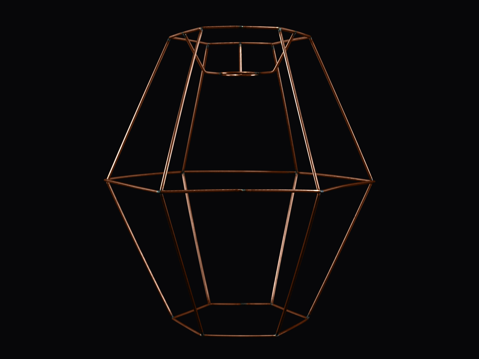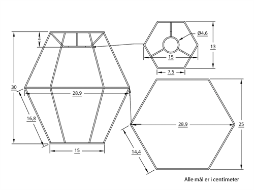 sekskantet satelit 13x25x30 L-E27 rå H30 i metal 3mm forkobberet jerntråd, anvendes til bordlampe, til dig som selv vil male stativet, det kræver at det får klar lak eller sølv, guld, sort eller hvad du selv ønsker, da det ellers vil ruste, top 13 cm, side 16,8 cm, mitter ring 25 cm, side 16,8 cm, bund 13 cm, højde total 30 cm, montering L-E27 i top 4 cm ned