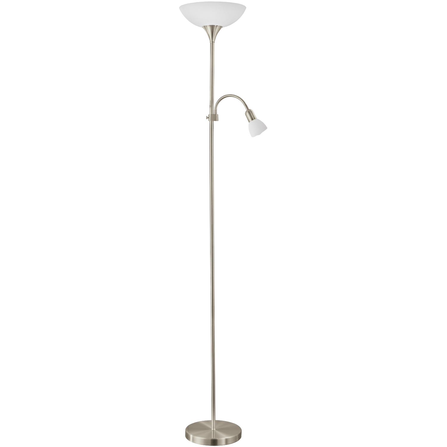 UP 2 gulvlampe i metal Satin Nikkel med hvide Akryl skærme, med afbryder på ledning, Uplight MAX 60W E27, Læsearm MAX 25W E14, Base 23 cm, diameter 27,5 cm, højde 176,5 cm.